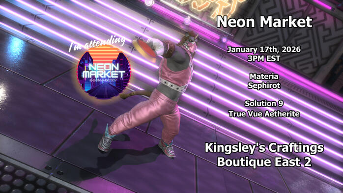 January 17th , 2026All orders made for pickup at/after Neon Market will receive a 20% discount from market board price! Additional 10% discount if you provide tomestone materials!1 set of crafted/gathered gear (no tools) will be added when it is completed during the market.